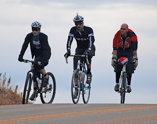 Gear Review #2: Chrome Shins knickers. 4.9 stars (out of 5) $160. I've worn these on many a mountain bike adventure, but this was the 1st time on the road. I have to say, I was very happy with this choice. The material is warm, stretchy, and breathable. I do have to hold them up with a belt (I prefer the leather variety) which makes them look pretty appropriate off the bike too. The side pockets are deep and the cargo pockets have zippers. Nothing ever falls out of these pockets, which is a big plus. There's a thin fleece-like square patch where your bottom contact the saddle. It's not a chamois and is not bulky, but it does add some comfort for sure. I wore them over a pair of regular padded cycling shorts and my bottom was comfy for the whole ride. The soft-shell material blocked the wind really well, kept me warm even when we got wet and muddy, and never bunched or felt uncomfortable. It's cool that they have a fly too, something you don't often find on cycling gear. It came in handy 5 times on the ride. How would I improve them? Hmmm....I think some discrete reflective tags on the back would be nice and that's about it! I highly recommend them. (oh...and they're handmade in San Fran!) We headed out with about 40 cold-weather-loving adventurous souls. After the icy ride through Ft Collin's bike paths, we hit the hills around Horsetooth Res. We were pyched to be warming up. It was in the high 20's for the start. The 1st Pow-Wow of the day - overlooking the resevoir. This was not the type of stop that Eric and I were used to, but we figured when in Rome....do as the Pow-wow does. Or in this case, rest for about the same amount of time that you pedal. There were come really cool rigs on this ride. Here's a Blacksheep SS rigid MTB, with a custom front rack that perfectly held a weather-proof tupperwear container. It was GOOD LOOKIN. NBB's Sarah joined the ride. She was 1 of a handful of ladies on the ride. We know Sarah b/c she did the Rio Grande Urban Assault Ride last summer. She had a stylin IF with a sweet wood box on the back. She had a fully-stocked backpack as well, so one had to wonder what was in that wood crate. Perhaps she had a small deceased pet in the box that she was taking up to the mountains for a proper burial. Nope - just coffee and clothes. You know...the mind can wander on rides such as this. We got rolling again and admired some impressive cycling stylings. Check this fixie w/o brakes. Man, I hope you were REALLY comfy on this bike. It was a LOOOONG day in the saddle...and we had gears AND brakes AND tire clearance. This fellow is an example of the mysterious endurance fixie niche. Another couple of notables. Holmes on the left also had a brakeless fixie but he was pimping an old school plastic BMX style saddle. Very classy, yet you have to wonder about the comfort.Top O the Pass (photo courtesy of Rick Price)